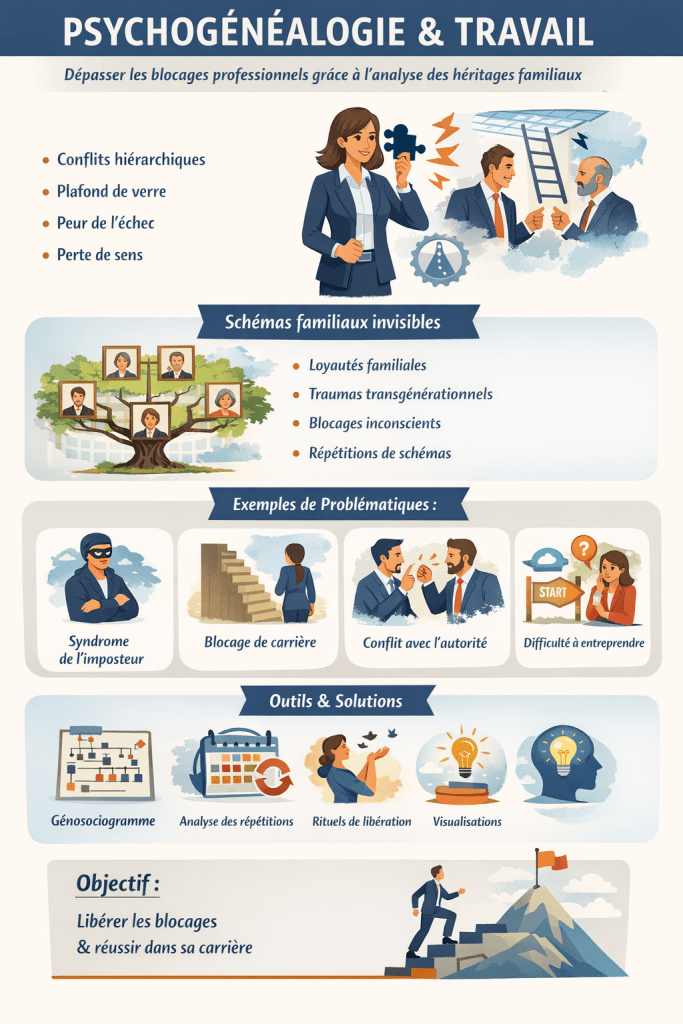 De nombreuses problématiques rencontrées dans le monde du travail trouvent parfois leurs racines bien au-delà de l’histoire individuelle. La répétition de certaines situations professionnelles — difficultés à s’affirmer, blocages dans l’évolution de carrière, conflits hiérarchiques, peur de l’échec ou de la réussite — peut s’inscrire dans une mémoire familiale transgénérationnelle.